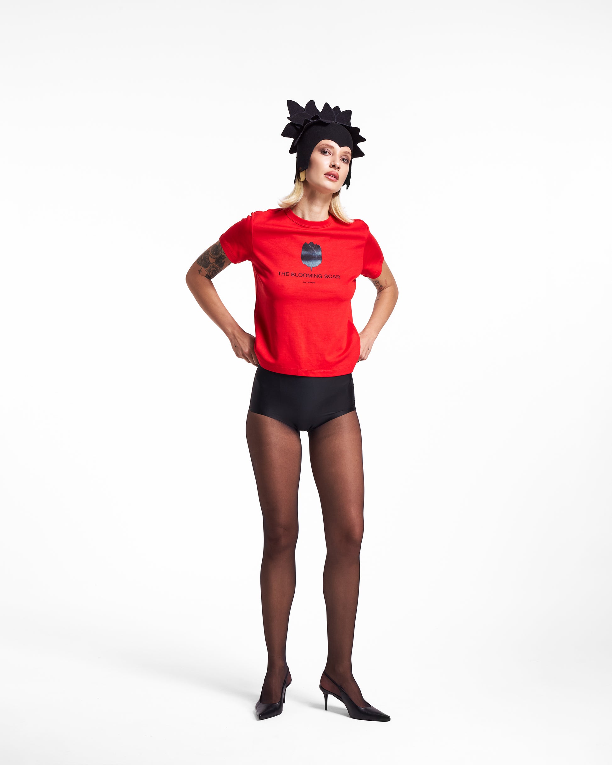 A statement T-shirt in an intense shade of red, featuring a black tulip printed at the center — a symbol of passion, pain, and rebirth.